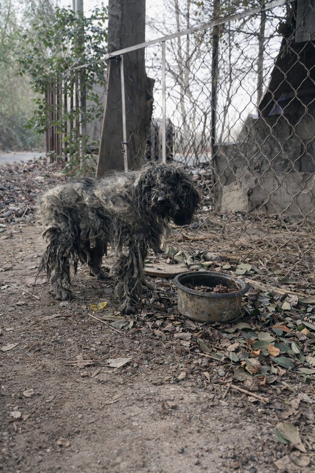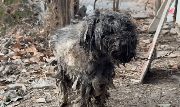 When rescuers discovered him, he wasn’t roaming the streets or crying for help. He was chained in a dark, filthy corner, surrounded by the suffocating smell of abandonment. His coat, once meant to protect him, had turned into thick, hardened mats that clung to his body like layers of forgotten cloth.