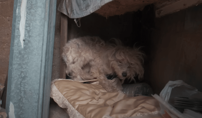 When rescuers finally discovered him, the little dog was pressed tightly against the wall, as if he hoped the darkness could swallow him. His body was thin and rigid with fear. His fur was so severely matted that it looked like a single solid layer of dirt, tangled with debris and grime.