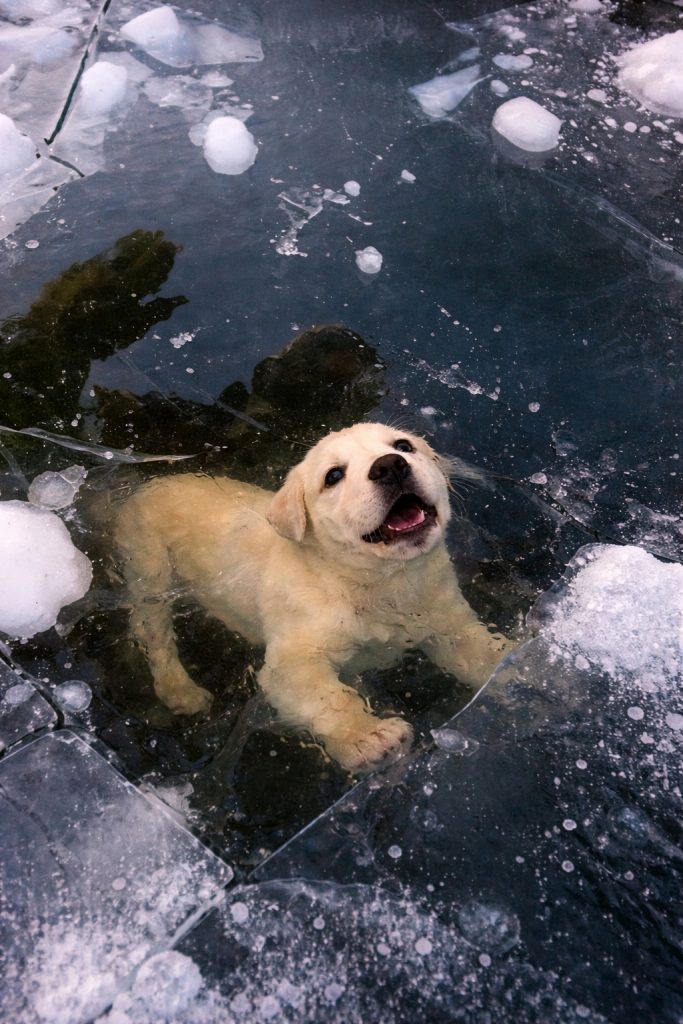 Cold water rushed up as he plunged his arms through the opening, grabbing the dog and pulling him free — breaking the surface just in time.