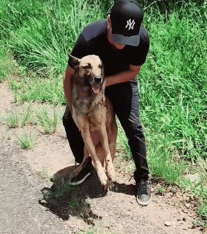 Instead, he lowered himself beside the dog, moving gently, speaking in a calm, reassuring tone.