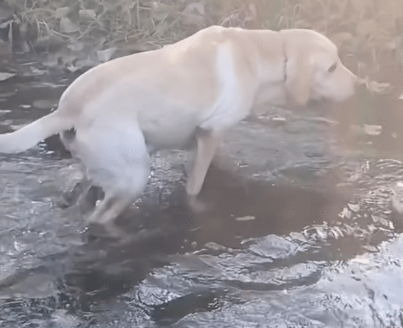 But slowly — gripping the rope, balancing carefully — he reached the trembling Labrador.