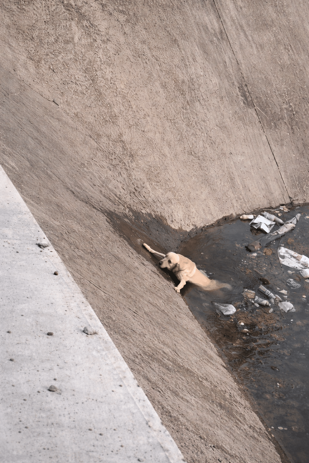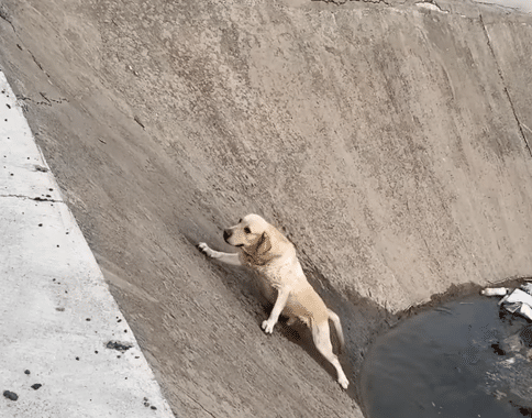 A Labrador was trapped at the bottom of a deep concrete pit, half-filled with stagnant wastewater and scattered trash. The walls were high, nearly vertical, and slick with slime.