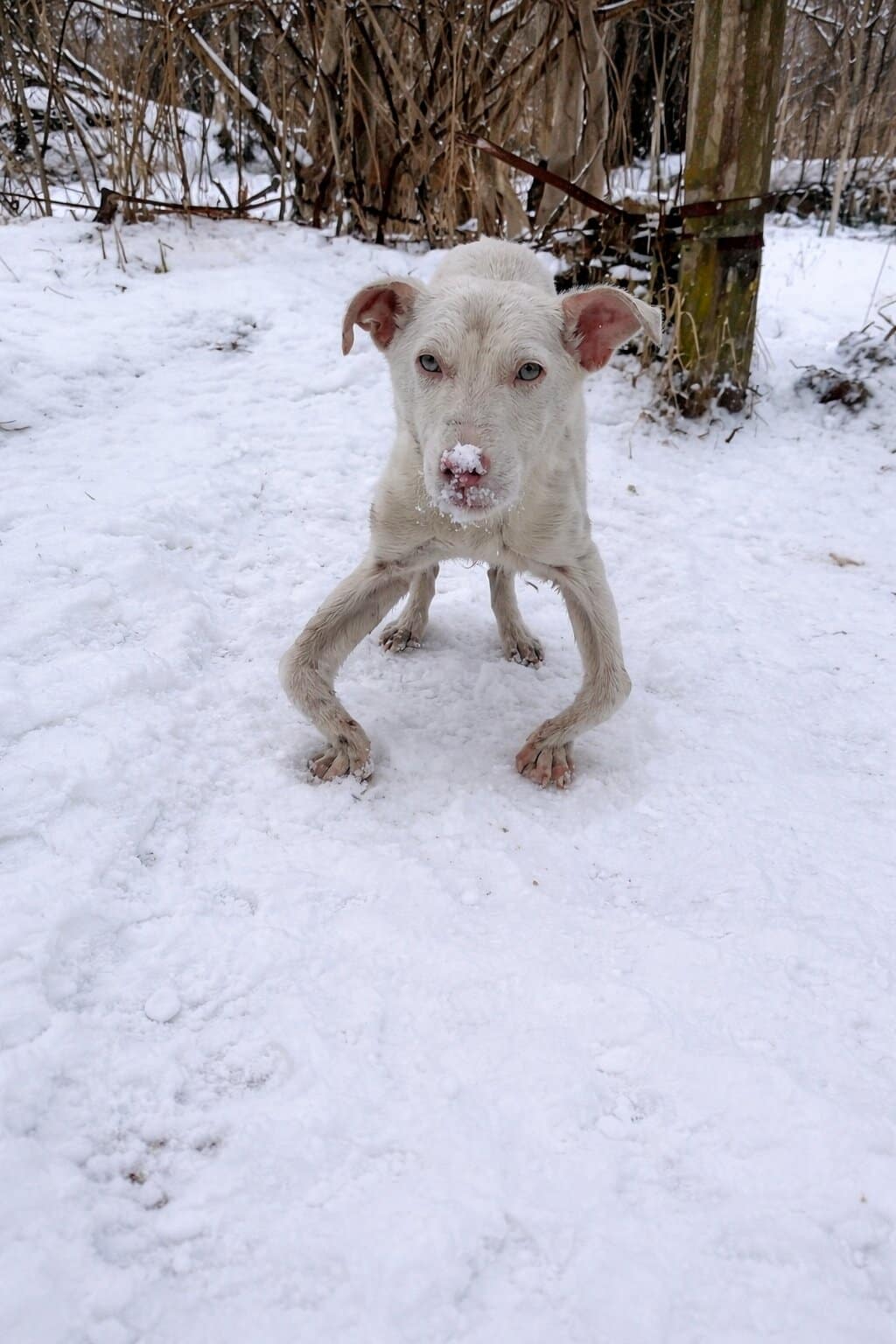 His body shook constantly, drained by hunger and exposure. His front legs were twisted, unable to support him. Even the smallest attempt to move looked painful—like it took everything he had left.