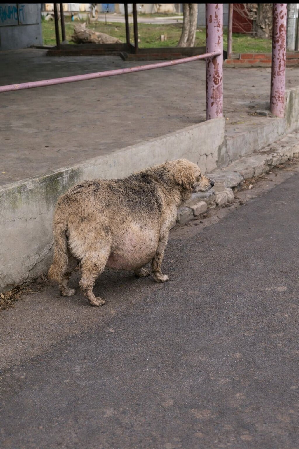 Zhuzha, a stray dog believed to be around two years old, had been wandering through the city for months with a frightening condition. Her belly had become unnaturally swollen, so large that simply walking seemed like an exhausting task.