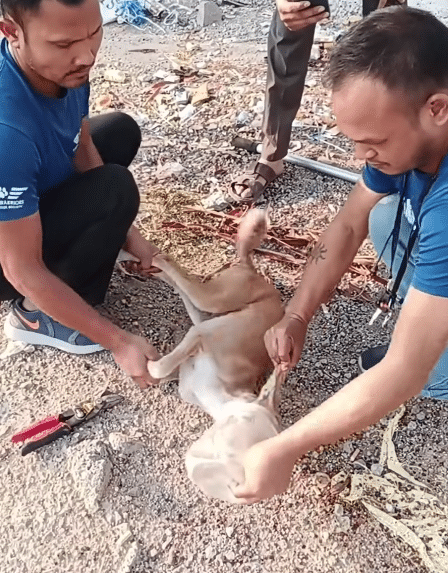 Thankfully, a rescue team arrives soon after receiving a report about the trapped animal.