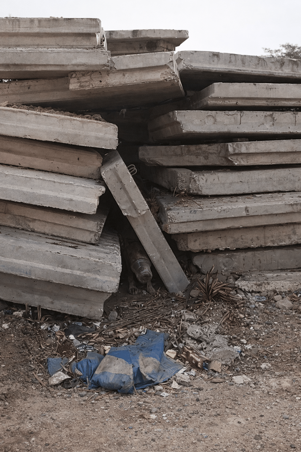 Between stacked slabs, a brown stray dog crouches nervously. At first, it looks like he’s simply searching for a safe place to hide. But as the camera moves closer, the heartbreaking reality becomes clear.