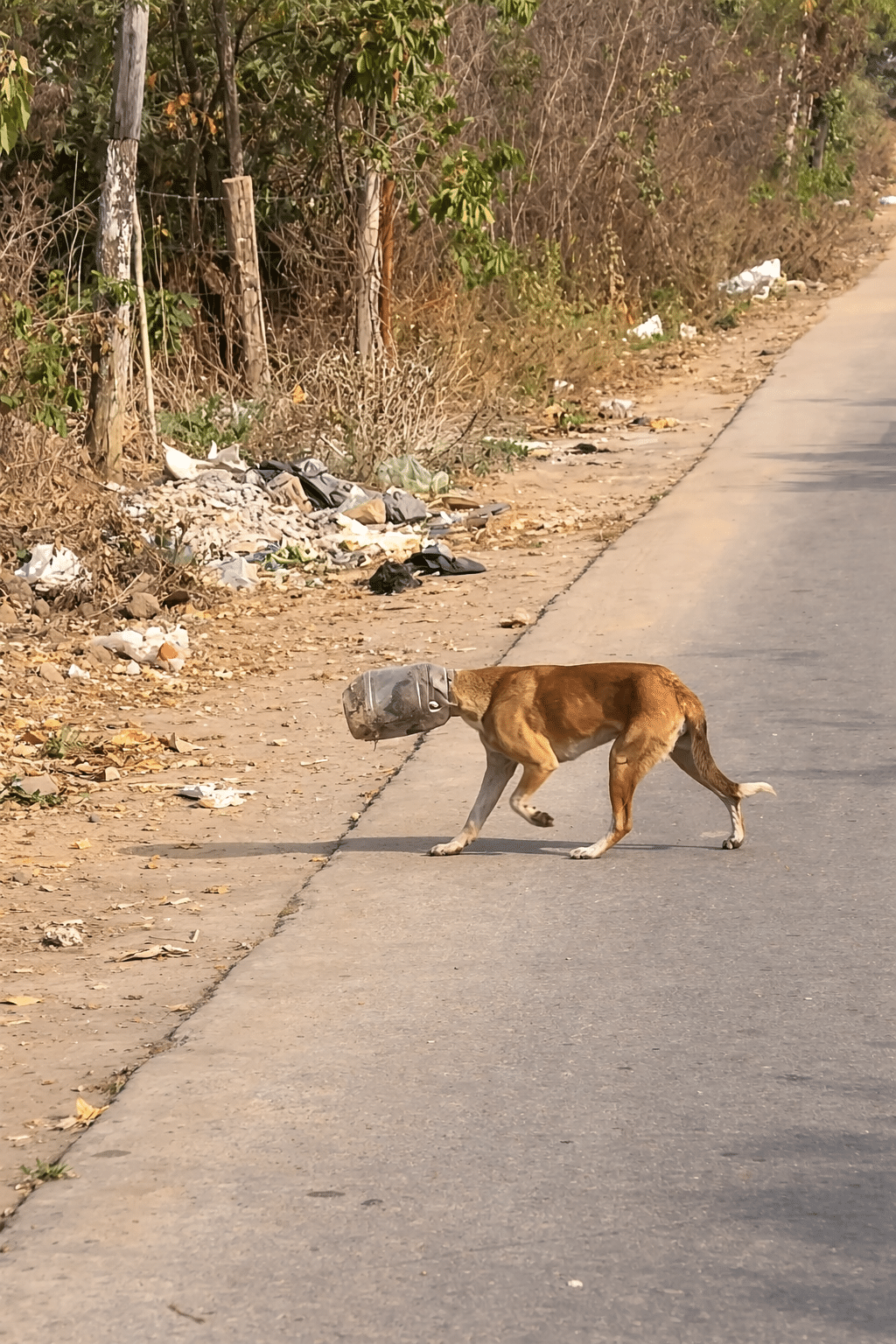 The location isn’t easy to navigate. The roadside is filled with scattered trash, thick bushes, and uneven ground. Approaching a frightened stray requires patience and caution, especially when the animal cannot see clearly.