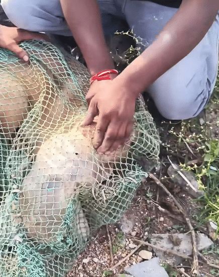 In one smooth motion, he throws the net and safely traps the dog before it can bolt away. The dog struggles for a few seconds, frightened and confused by the sudden capture, but the net keeps him safely contained so the rescue can continue.