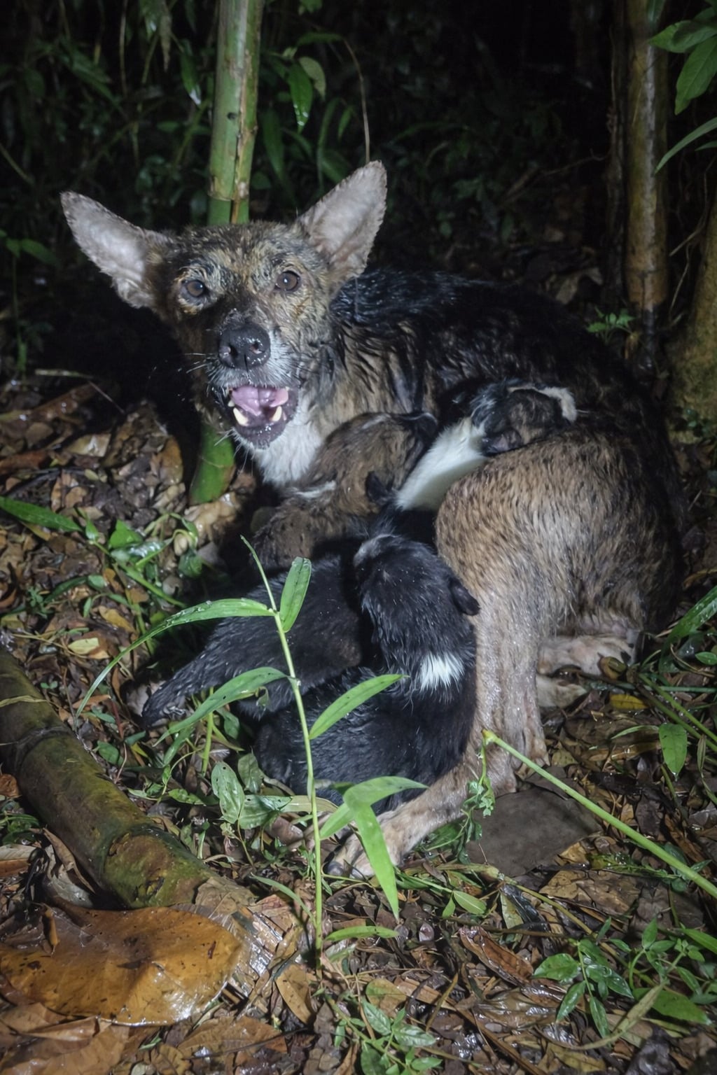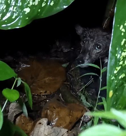 Tucked beneath oversized green leaves, a mother dog curled herself tightly around her puppies.