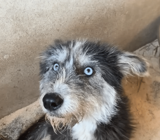 As the rescuers approached, a gray-coated mother dog stepped out of the pipe. She had piercing blue eyes, and instead of bolting, she moved toward them calmly.