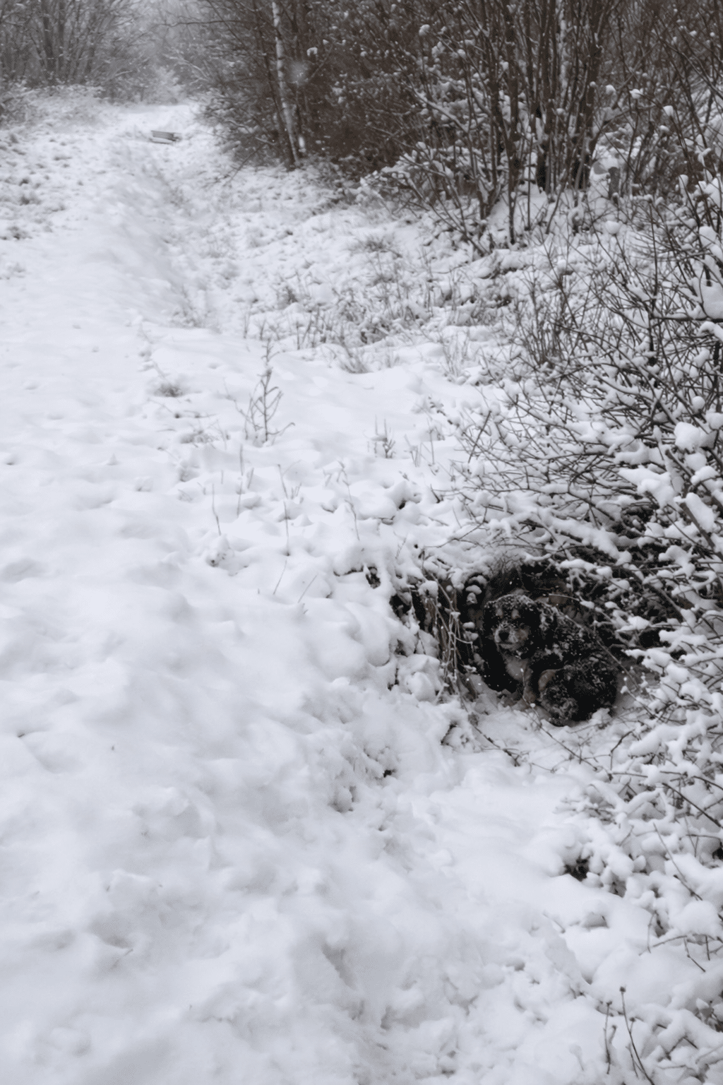 When rescuers arrived, the road was blanketed in heavy snow. But the dog hadn’t vanished without a trace.