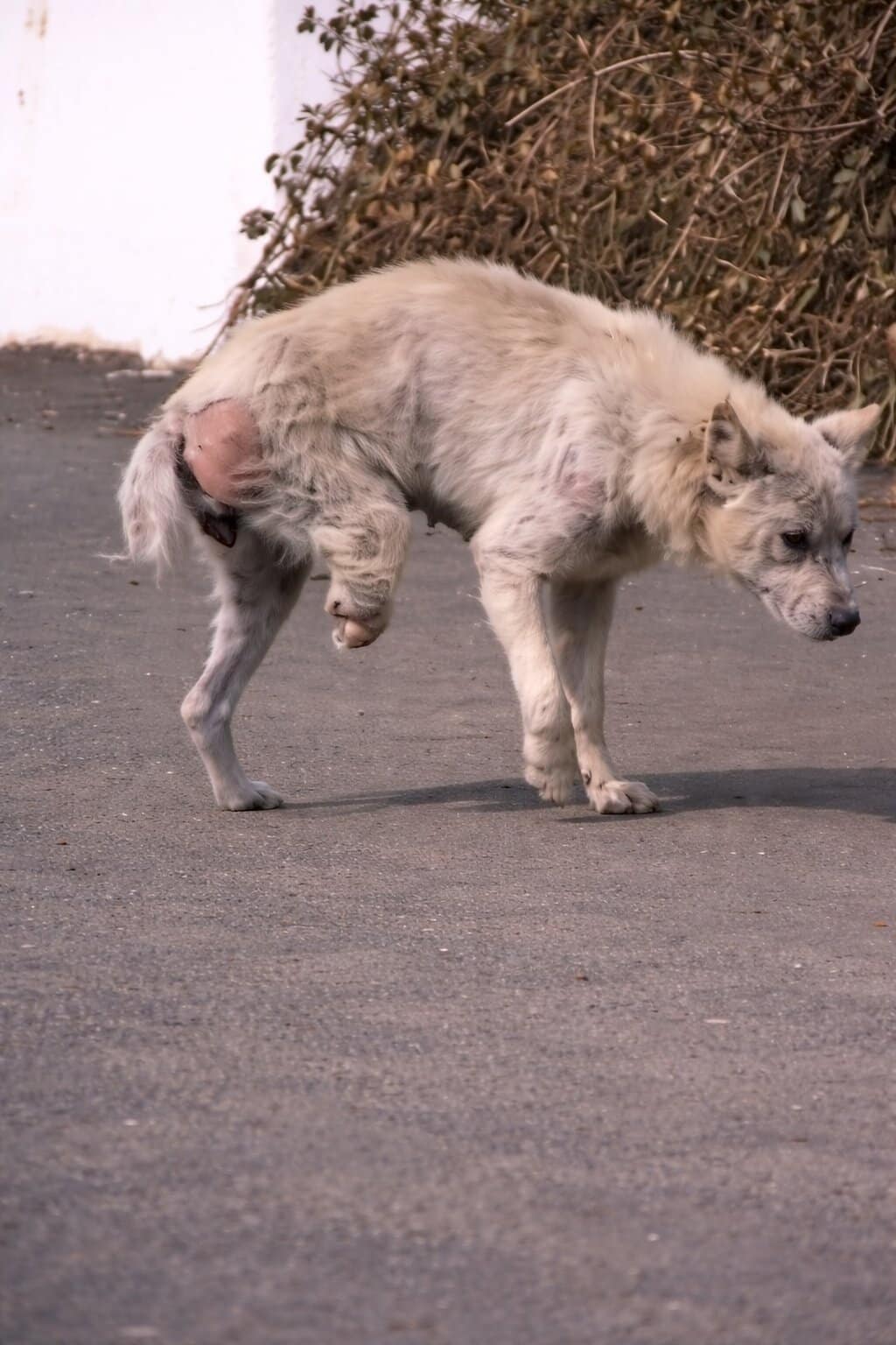 His fur was patchy, his skin irritated, and small wounds covered parts of his body. But the most troubling injury was one of his back legs.