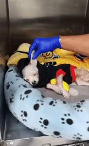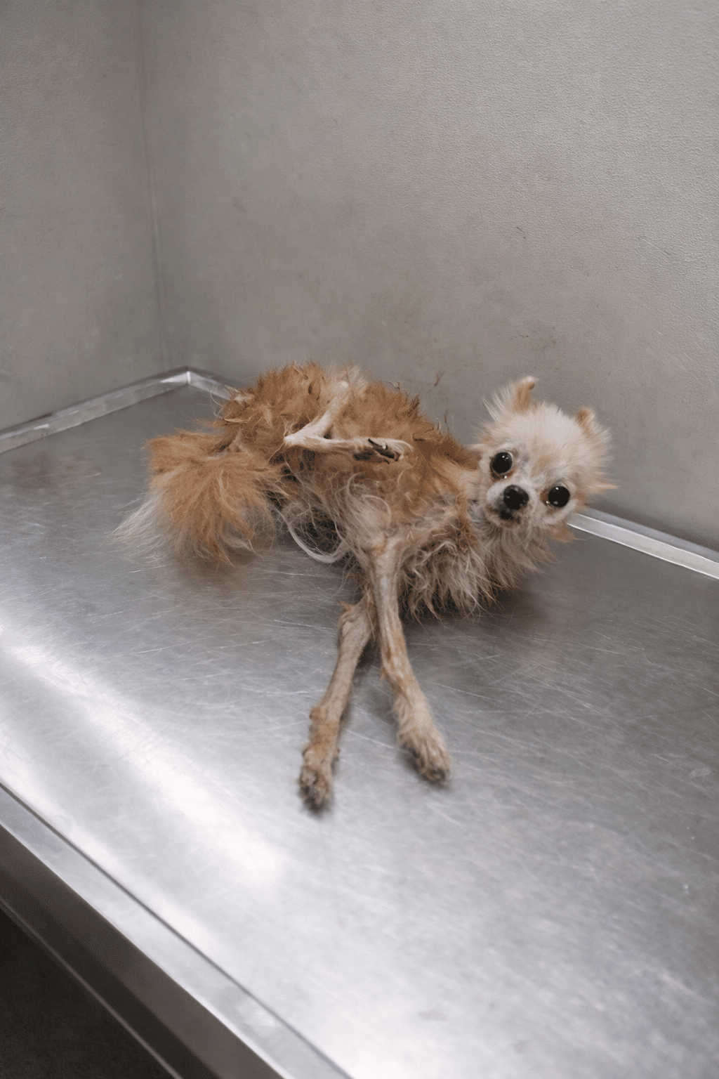 Every rib pressed sharply against his fragile skin. His spine protruded beneath fur tangled with dirt and crawling parasites.