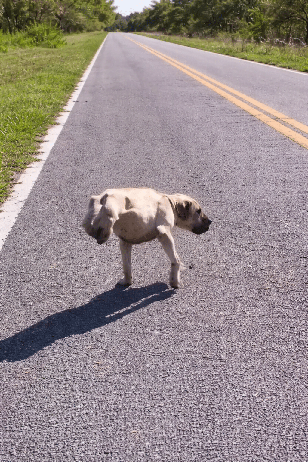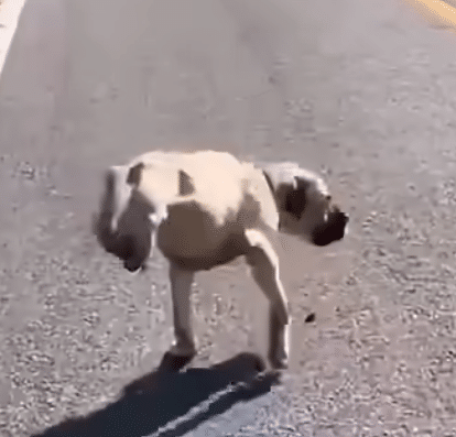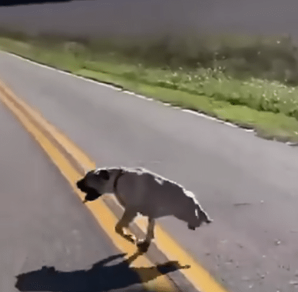 In the footage, Dixie barrels forward down an empty road using only his front legs.