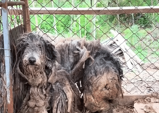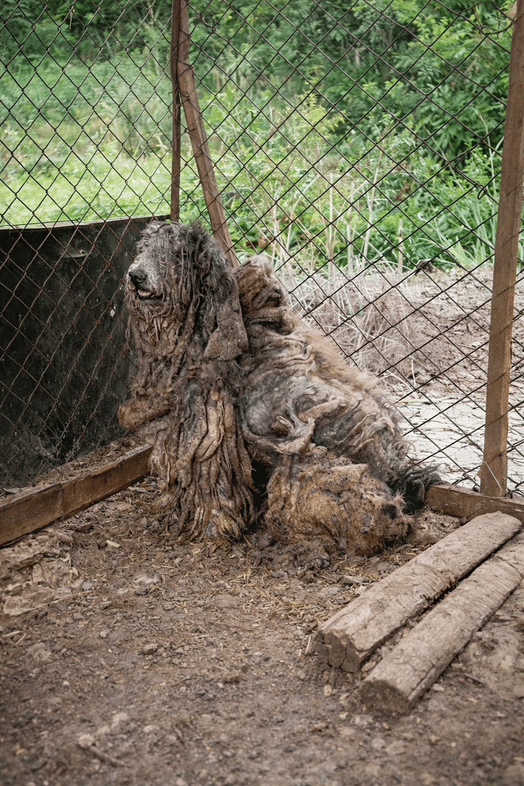 It looked like a mound of hardened fur — thick, twisted mats hanging like armor over a painfully thin frame. Dirt, moisture, and infection had been trapped beneath the dense coat for years.