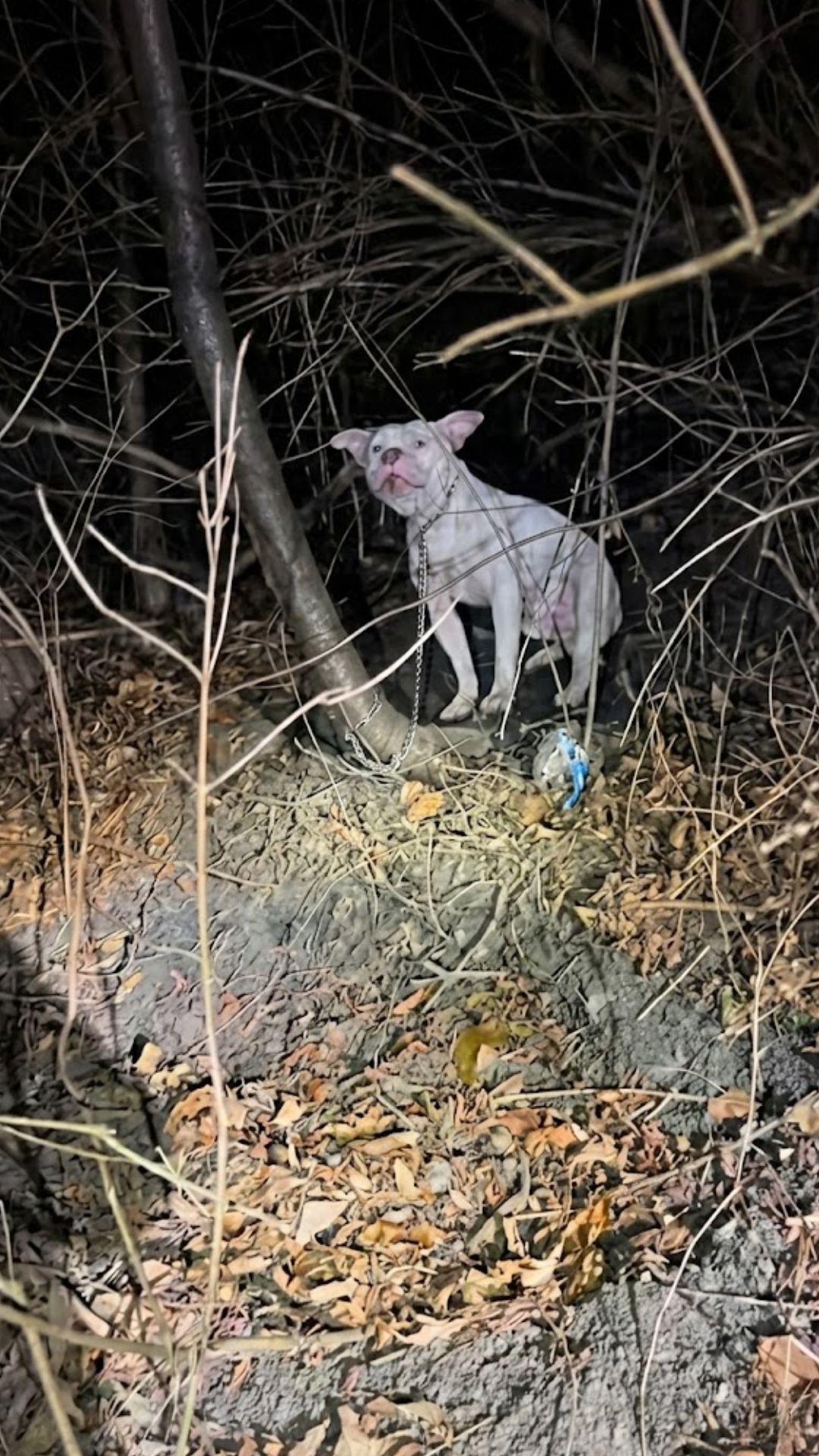 Tied to a tree with a short metal chain was a white Pit Bull mix. Alone. Shivering. Abandoned in the freezing night with no food, no water, and no chance to escape the dropping temperatures.