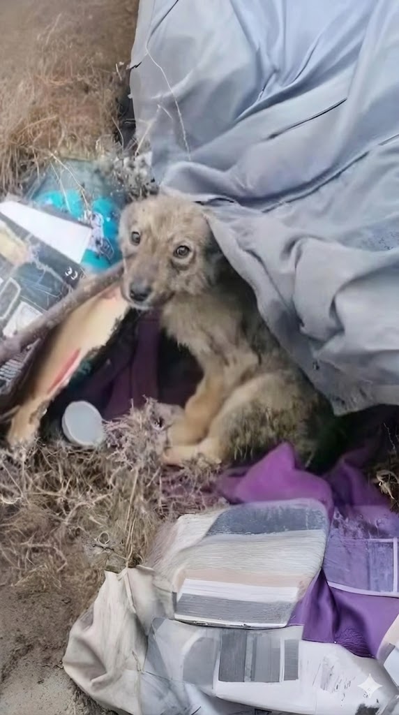Somehow, LittleFoot dragged himself away from the roadside and into a forgotten corner filled with scraps, trash, and broken debris. It wasn’t safe, but it offered the smallest barrier against the wind. His frail body shook constantly—not only from the freezing temperature, but from fear that had settled deep into his bones. Dirt clung to his thin fur, and his eyes held a guarded exhaustion no puppy should ever carry.