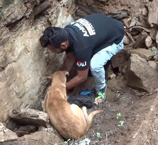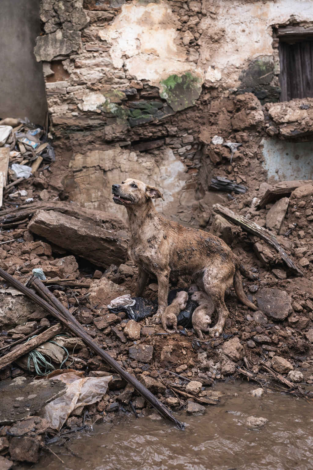 The call came in about a house that had collapsed into a mess of broken stone and dust. When rescuers reached the site, they found a mother dog standing right in the middle of the rubble.