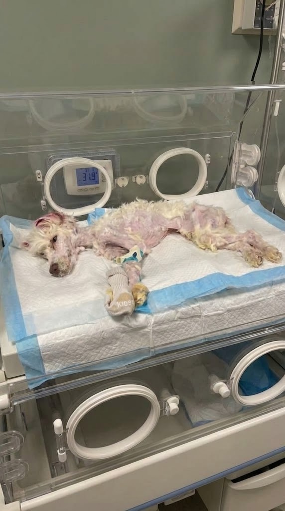Inside a filthy, rust-eaten cage lay a small dog barely clinging to life. The once-famous “pink puppy” was now skin and bones, her body covered in infected sores.