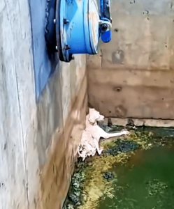 The footage begins inside a cramped, muddy drainage tunnel. In the dim light, a small puppy lies shivering in dirty water, his fragile body barely moving. He’s soaked, exhausted, and far too weak to climb his way out.