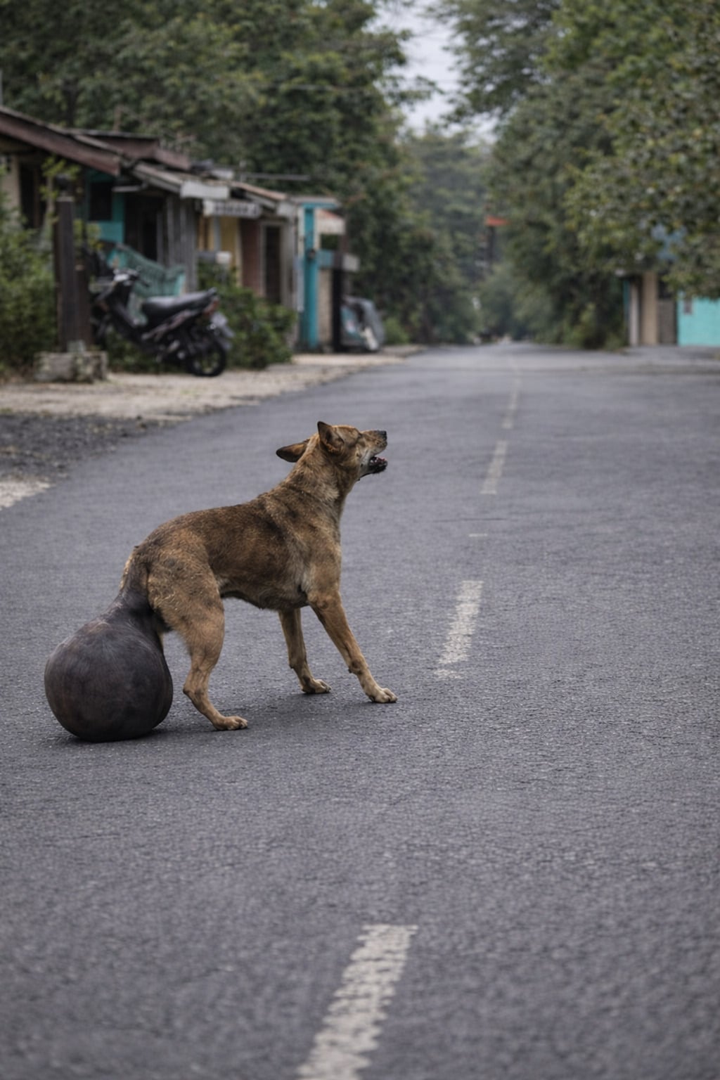 The video begins with a heartbreaking sight: a thin stray dog slowly making her way along the edge of a quiet roadside.