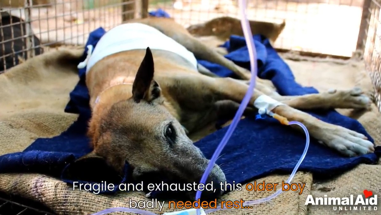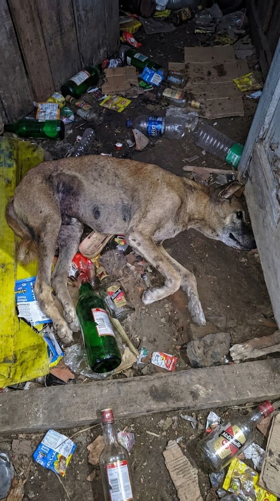 In the far corner of a garbage-strewn lot, Glimmer lay almost invisible among the debris—broken, helpless, and completely alone. His body had clearly suffered a devastating trauma, though no one knew exactly what had happened. He wasn’t an old dog, but the suffering carved into his face made him look like he’d carried years of pain.