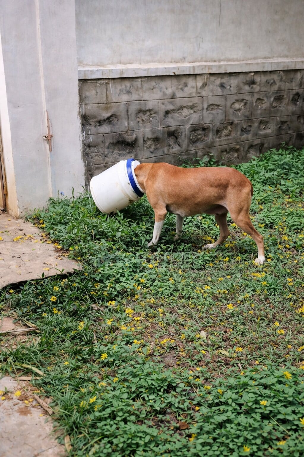 A brown dog, likely sniffing around for food or investigating something that caught his attention, somehow managed to push his head inside a white plastic bucket. At first, it probably didn’t seem like a problem.