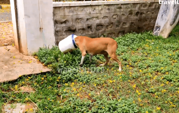 The plastic container covered the dog’s entire head, instantly blocking his vision. Suddenly, he couldn’t see where he was going—or what was around him.