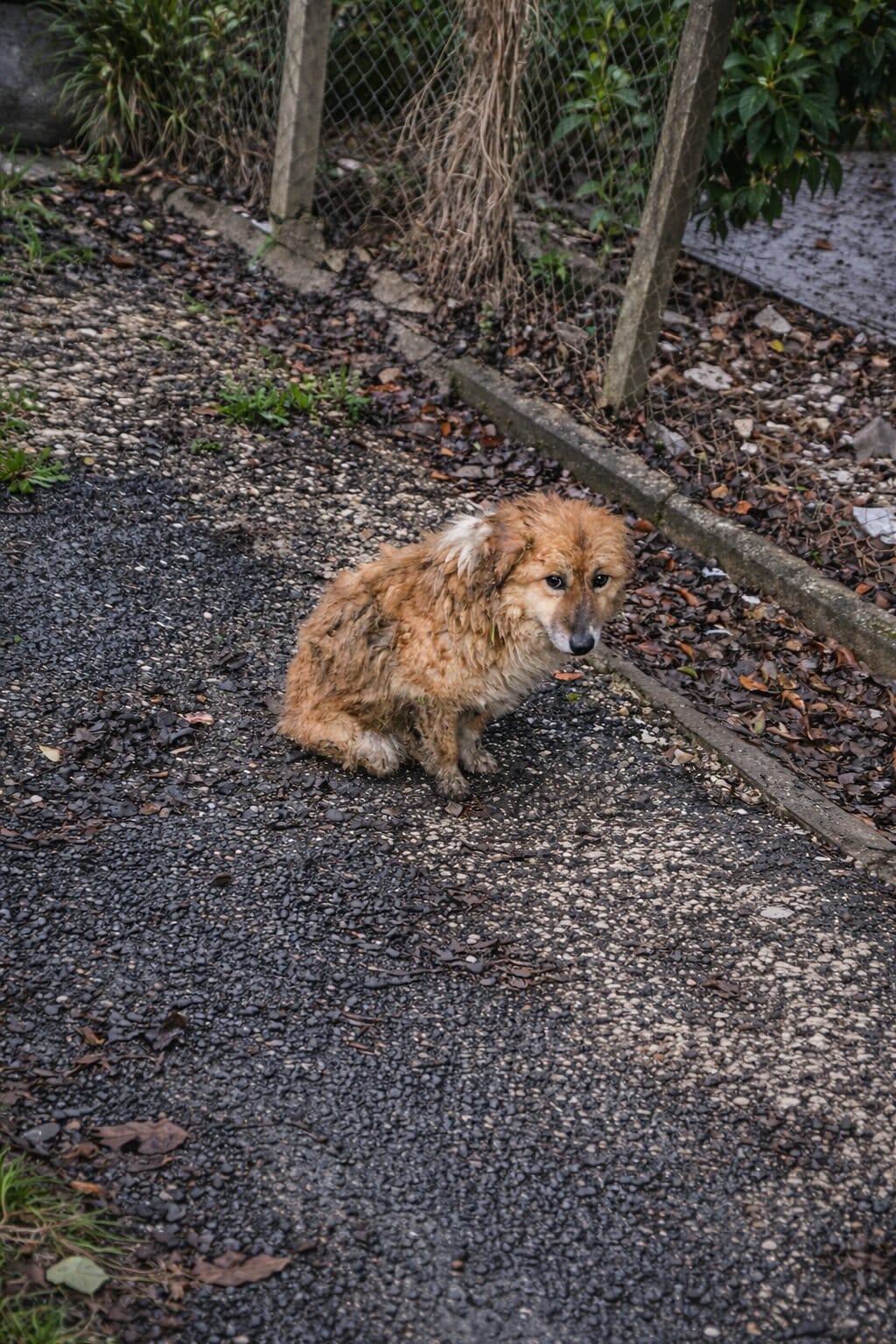 Just a fragile figure sitting in the rain—completely soaked, completely still.