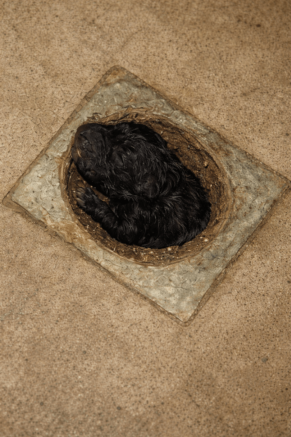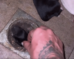 He scanned the area slowly, listening. That’s when he caught it — a faint, almost imperceptible whimper coming from beneath a roadside drain. Beneath the metal grate, wedged in the darkness, lay a tiny black puppy.