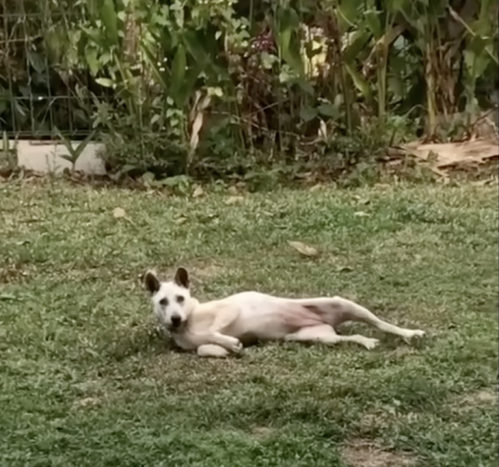One quiet afternoon, a neighbor noticed something strange. Buddy wasn’t pacing or watching from afar. She was lying still, her body curled in on itself. When someone approached, she didn’t run. She didn’t snarl. She simply stared back—tired, uncertain, and strangely calm.