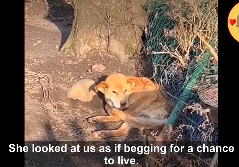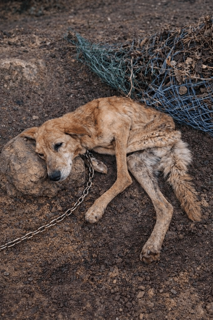 A heavy chain limited her world to a small circle of dirt, barely two meters wide. At some point in the past, she must have been a beautiful dog—healthy, energetic, full of life.
