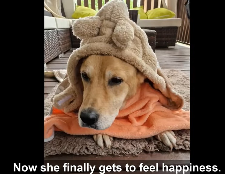 The hard ground where she once lay has been replaced with a warm orthopedic bed. The heavy chain that once confined her life is gone, replaced by the loving care of the people who saved her.