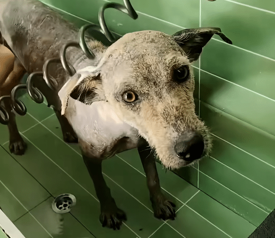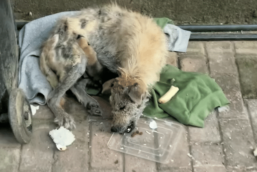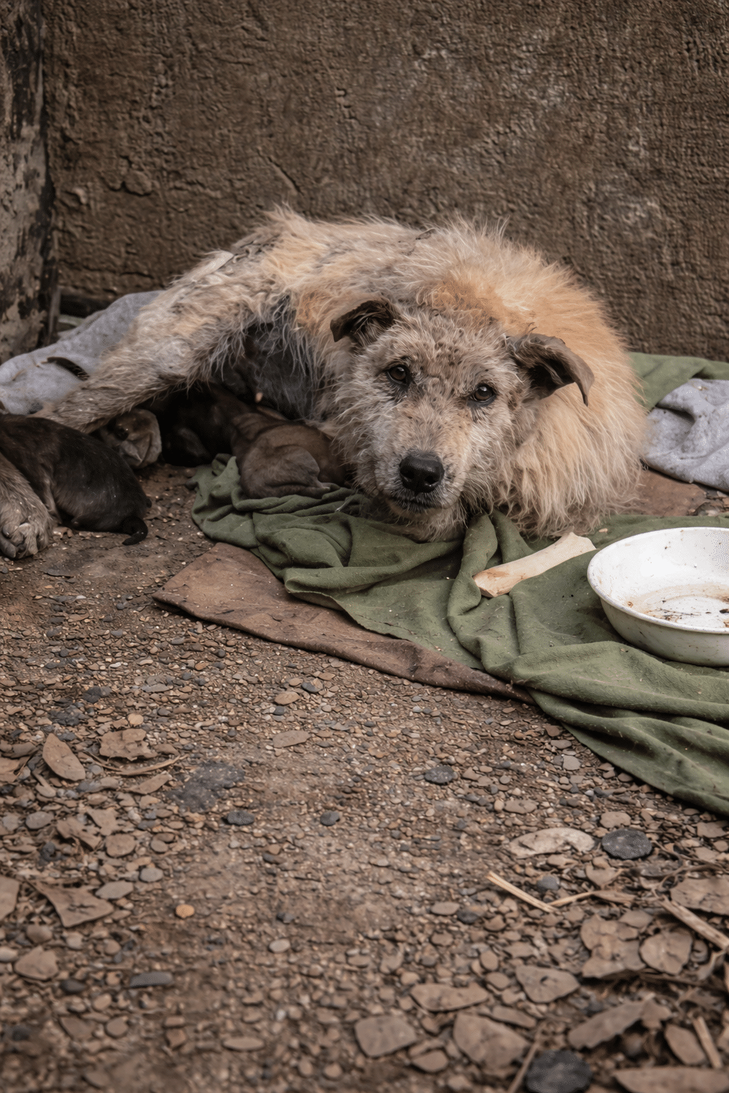 She was painfully underweight. Her coat was patchy, with raw inflamed skin showing through. After delivering her puppies, she looked completely drained — like she had used the last of her strength just to bring them safely into the world.