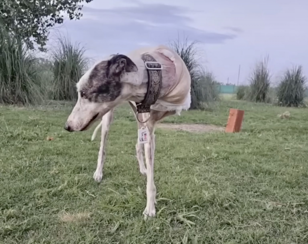 In that stillness, a greyhound lay completely still.