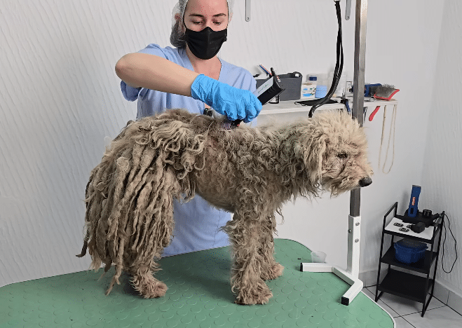 As the heavy mats fell away, a different dog appeared. Smaller than expected. Softer. Almost fragile.