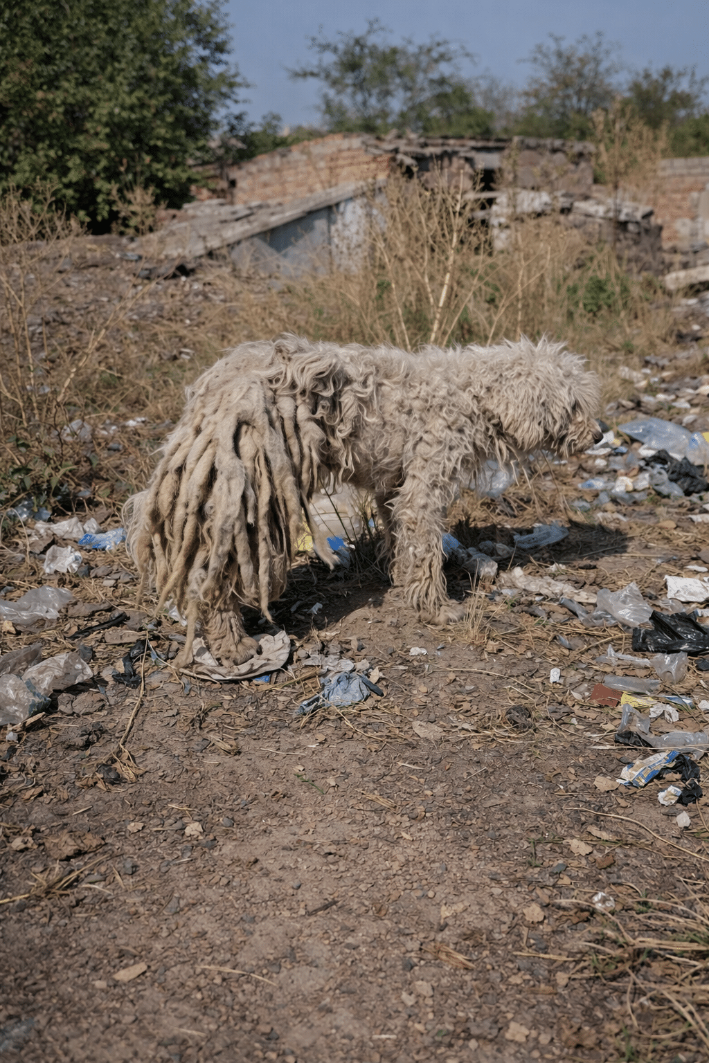 At five or six years old, she barely resembled a dog at all. Her entire body was buried beneath thick, matted fur—long, twisted strands clinging to her like ropes that had been tightening for years.