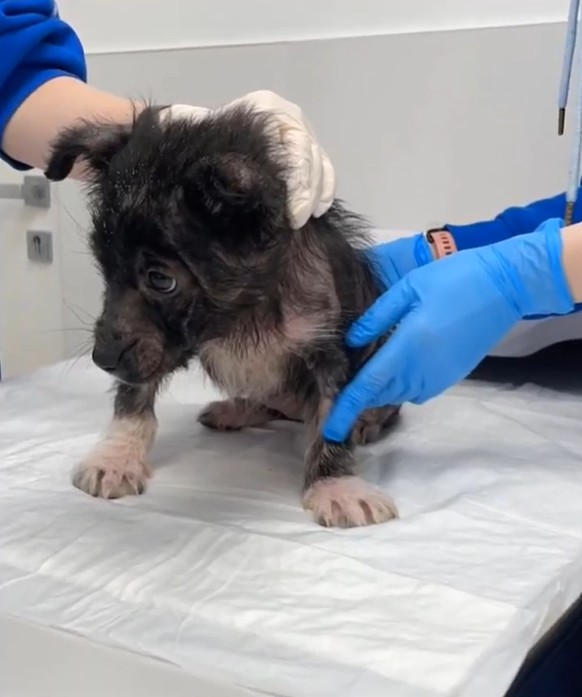 Most of her fur was gone. Her skin was inflamed, cracked, and covered in infection. Her stomach was swollen — not from good meals, but from parasites and whatever contaminated scraps she had swallowed to survive.