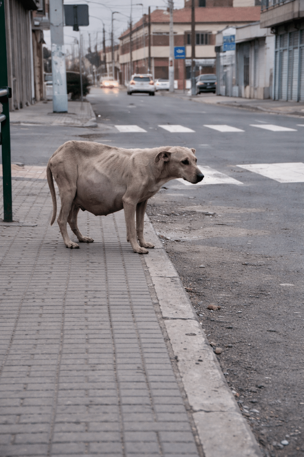 She moved slowly along the edge of the road, each step careful… almost hesitant.