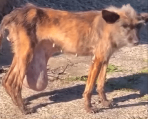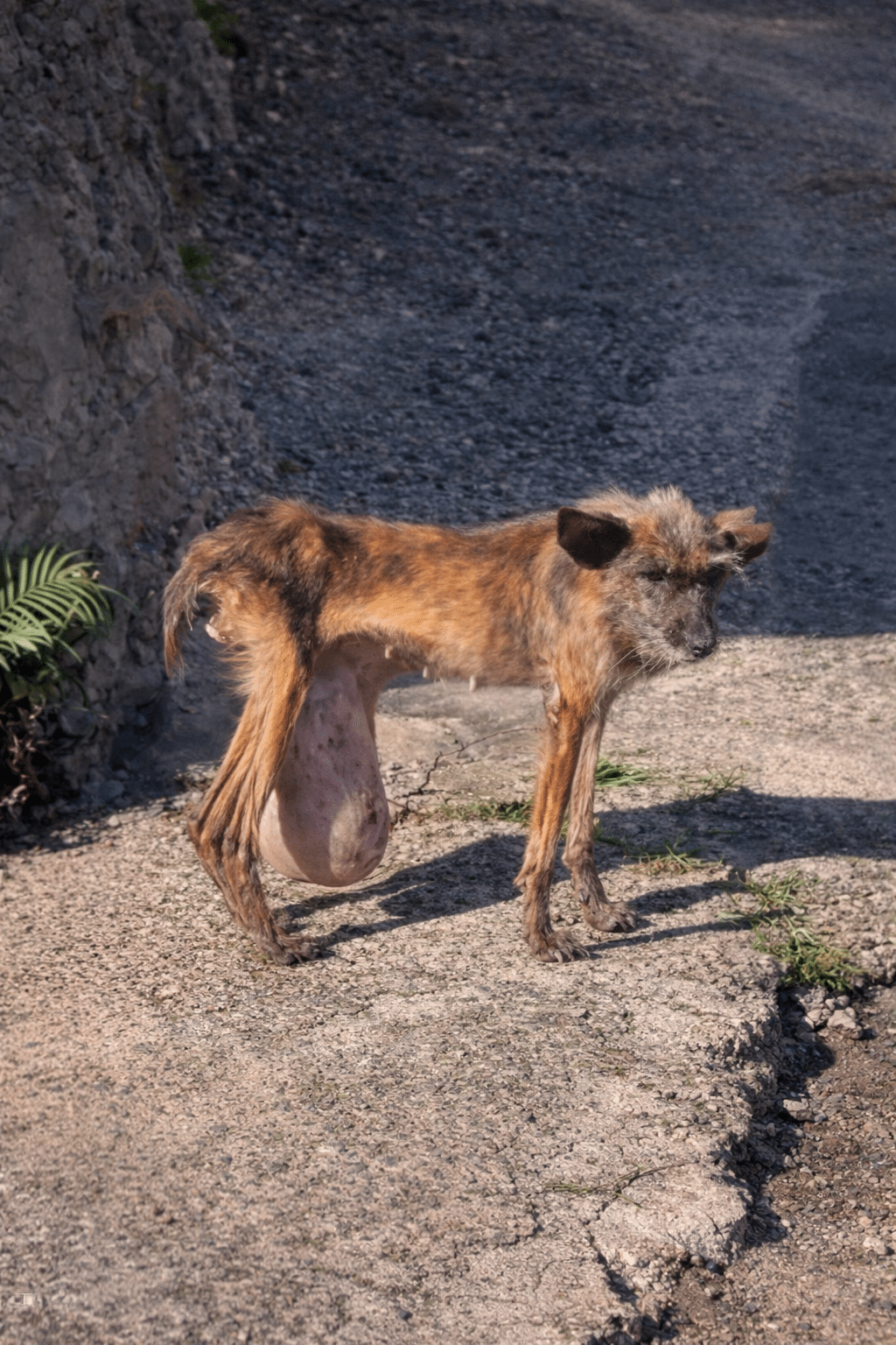 Beneath her tiny frame hung a heavy mass, swinging with every unsteady step she took.