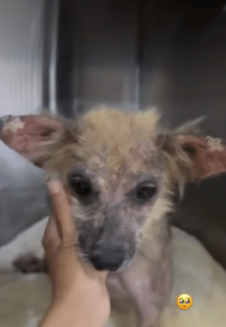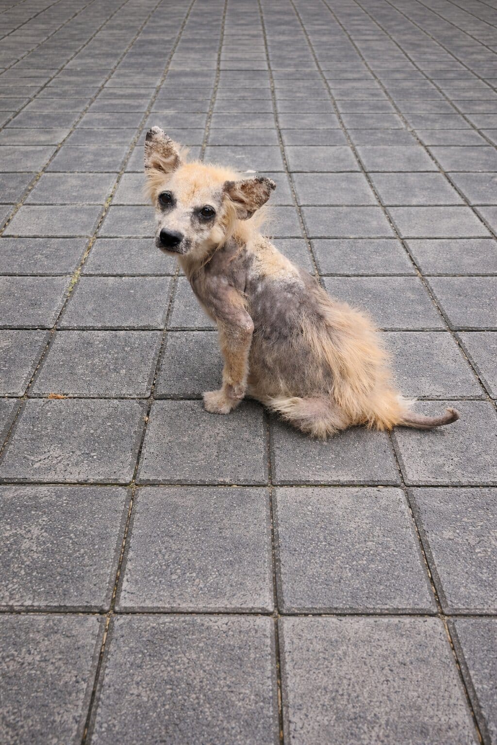 Hidden in a narrow alley, far from noise and notice, a stray dog stood motionless. Her body showed the quiet damage of time—patchy skin, fragile frame, and exhaustion etched into every step.