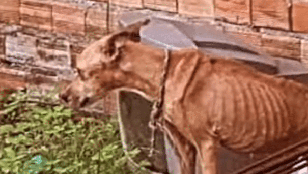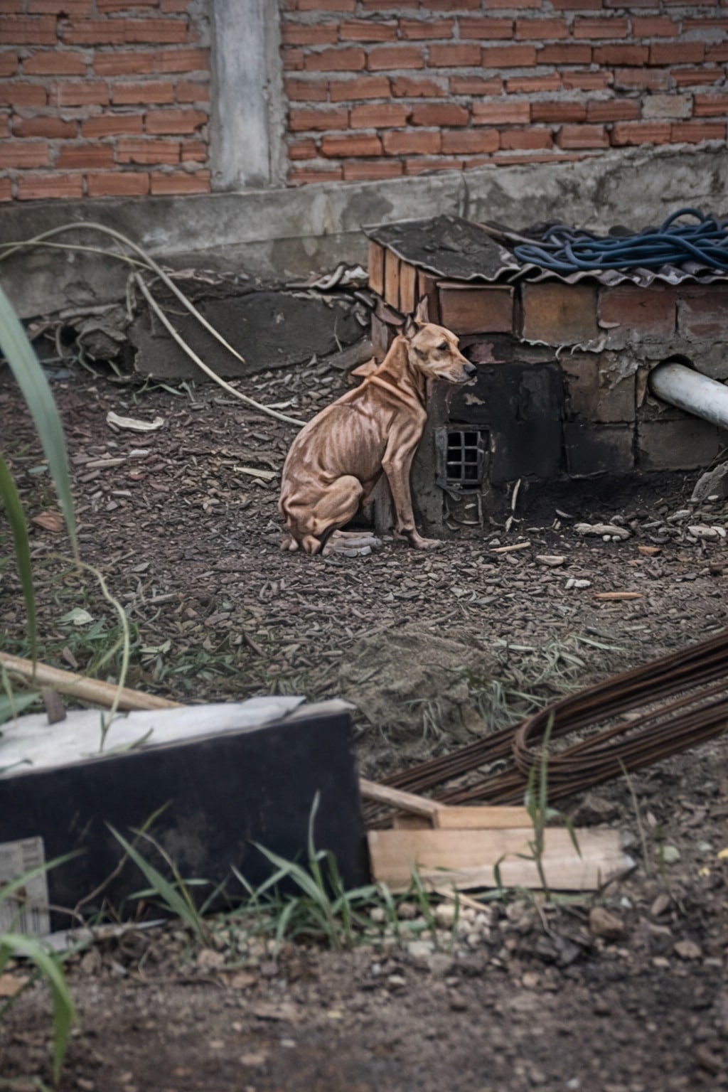 In a neglected corner of a yard cluttered with broken debris and trash, rescuers discovered a female dog tied to a post with a thick iron chain. Her body was painfully thin, every rib visible beneath rough, patchy fur.