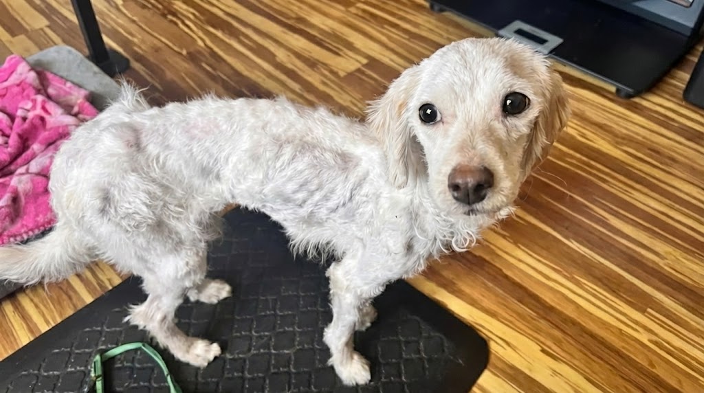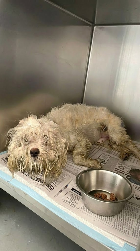 When I first saw her, my heart dropped. She was painfully thin, her ribs visible beneath tangled, filthy fur. Her eyes looked old — as if she had been surviving far longer than any puppy ever should.