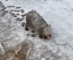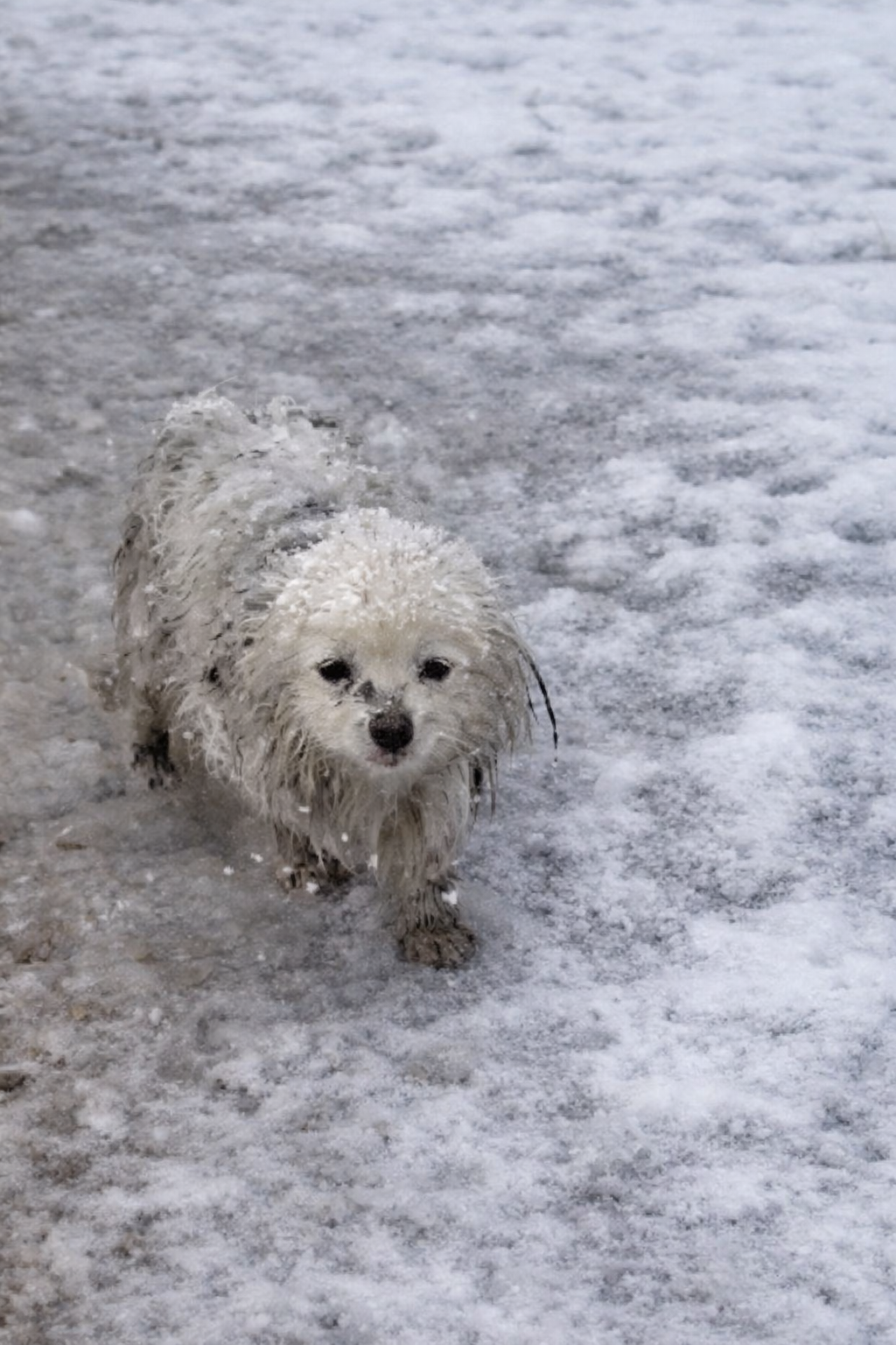 A small white dog running along the icy path with no clear direction. No leash. No collar. No human voice calling her back.
