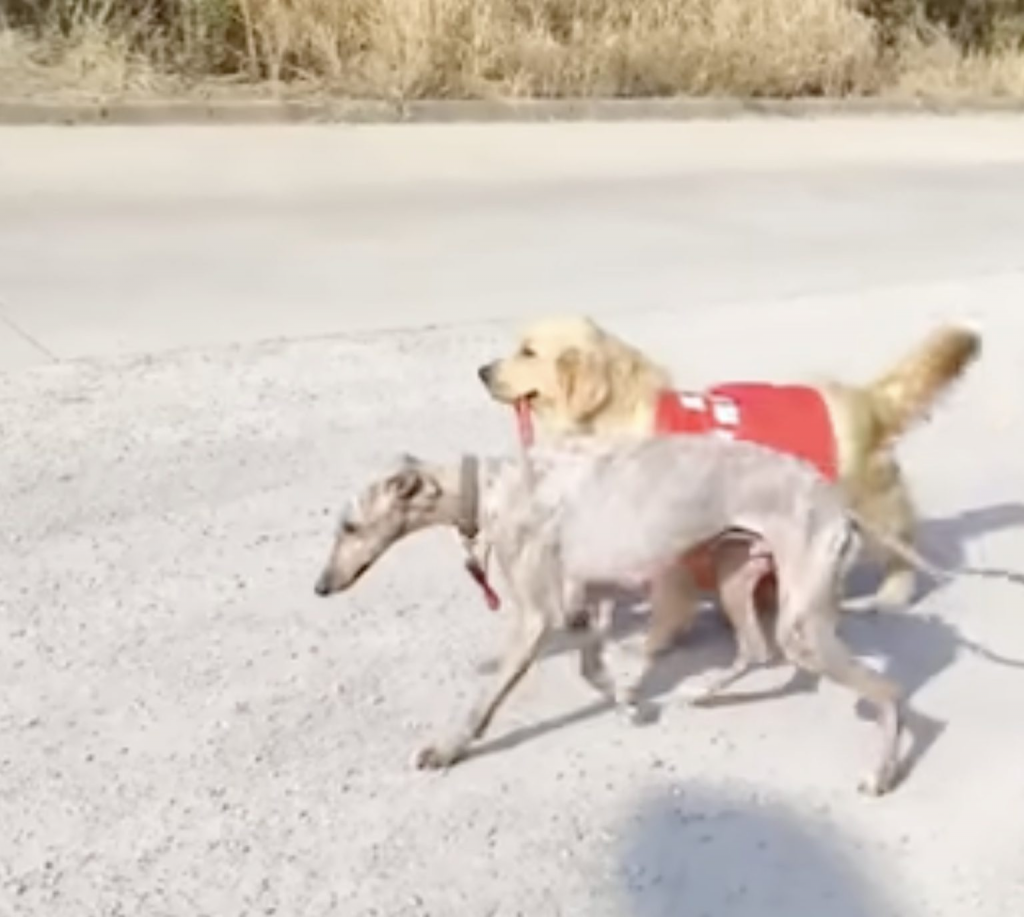 The Golden Retriever stayed close, never drifting far. At one point, he gently picked up her leash and guided her forward—step by step—as if he knew she still needed help.