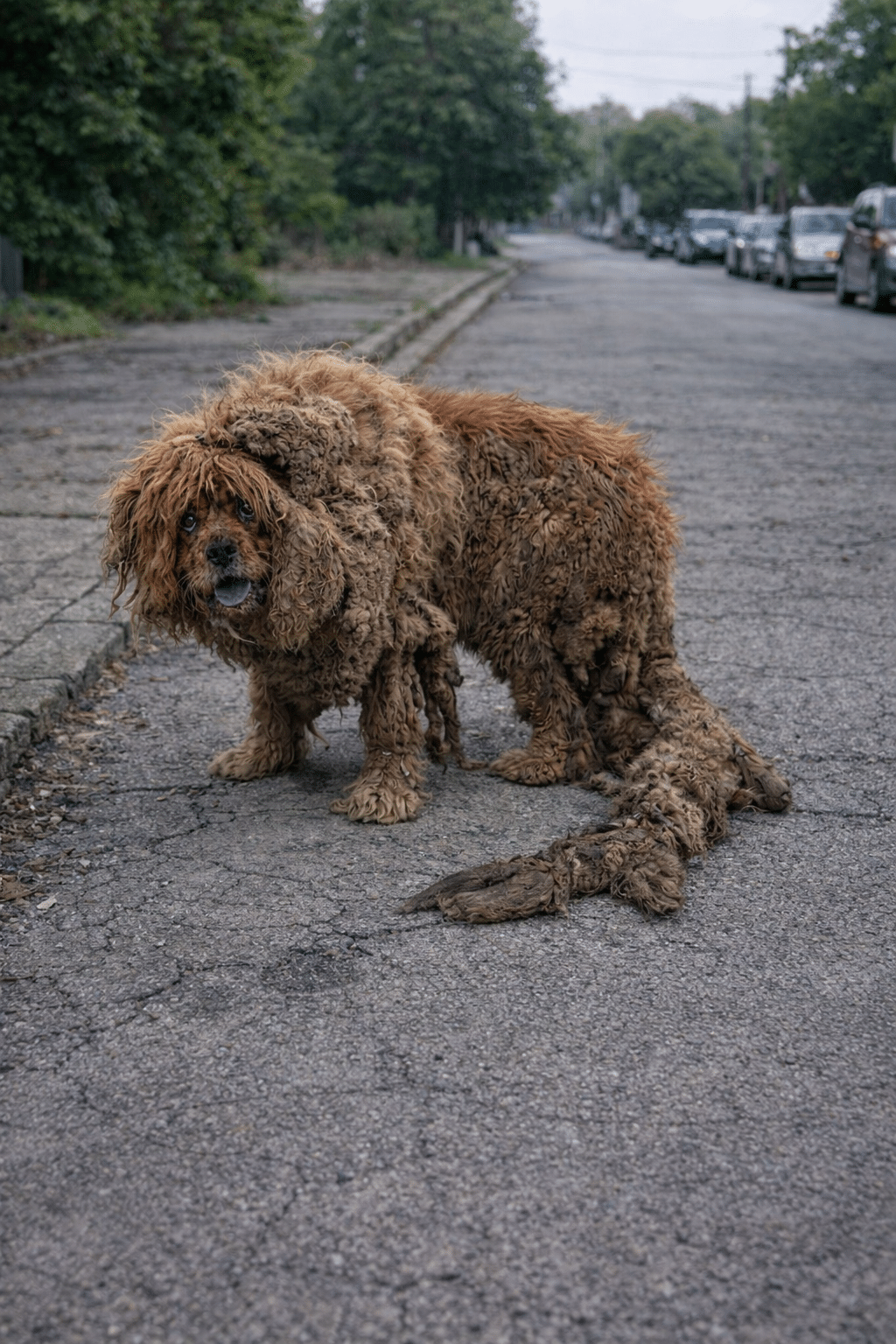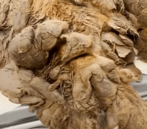 Sprout weighed over 130 pounds — but much of that weight wasn’t truly hers. Her coat had turned into dense, hardened mats filled with mud, waste, and parasites. Every step she took meant dragging months — maybe years — of neglect along with her.