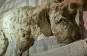 He was nothing but bones wrapped in fragile skin. His fur was completely gone, eaten away by a severe, untreated skin disease. His body was weak, trembling with exhaustion.