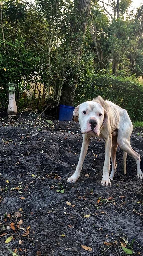 For nearly three months, a Dogo Argentino mix had been tethered to a tree in a dusty backyard. While neighbors came and went, while cars passed and lights flickered on at night, he stayed there—motionless, starving, forgotten.