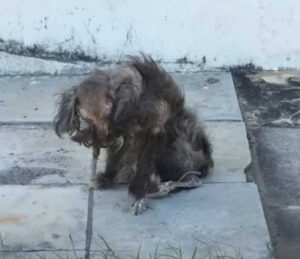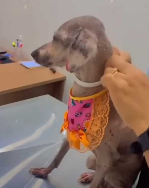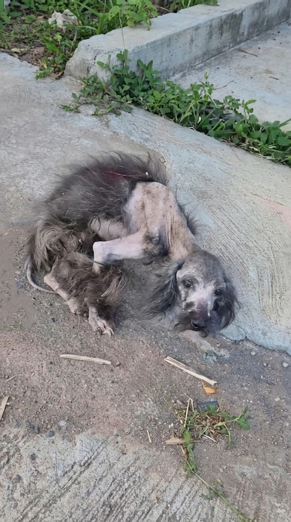 By the time help finally reached Mafalda, she barely resembled the dog she once was. Stress and hunger had stripped away much of her fur. Her body was painfully thin, ribs clearly visible beneath fragile skin. Yet it was her eyes that told the most heartbreaking story—wide, guarded, and filled with fear.