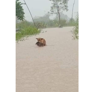 People living nearby heard the deep, ominous sound of rushing water and rushed outside. What they saw stopped them cold. A drenched mother dog stood in the rising flood, her body trembling as she struggled to keep her puppies above the water. The current was violent, thick with debris, capable of pulling anything under without mercy.